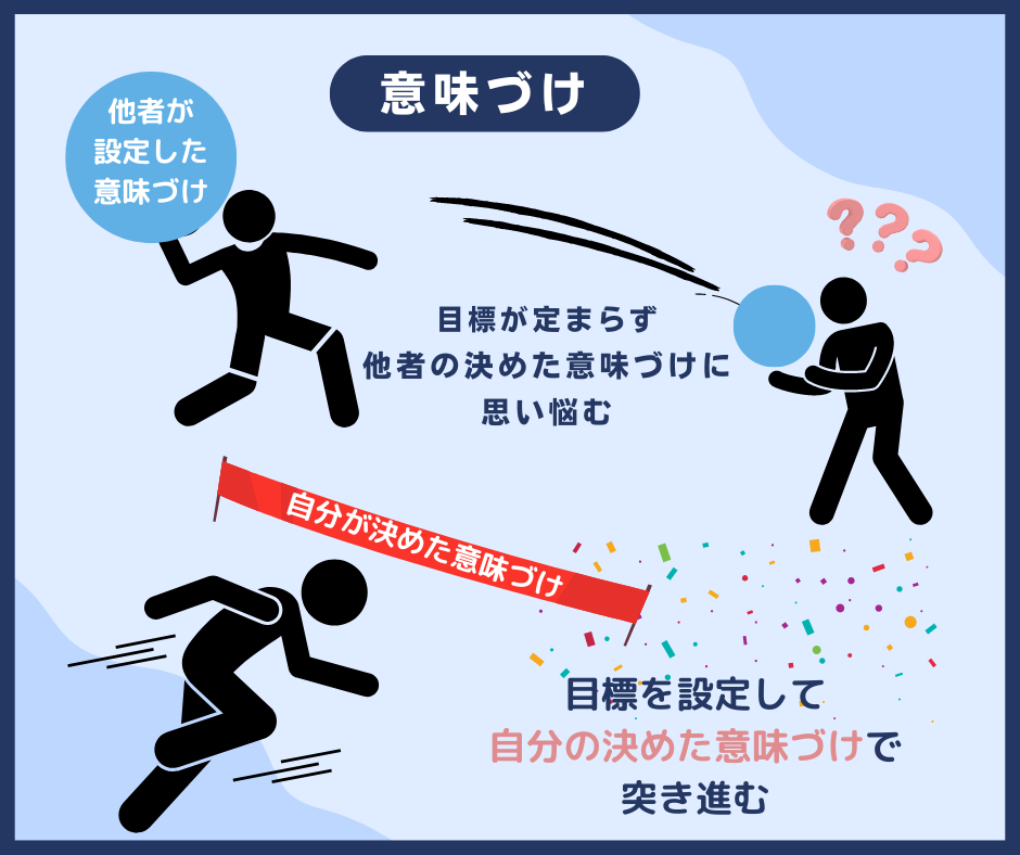 目標が定まらず、他者の決めた意味づけに思い悩むのは成長が止まる人、目標を設定して、自分の決めた意味づけで突き進むのが成長し続ける人。「すべての出来事には必ず意味がある」と言える人は、目標から逆算して、あらゆる出来事を自分の都合の良いように解釈して、我田引水で意味づけした人です。